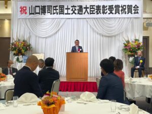 国土交通大臣表彰受賞祝賀会に出席しました。受賞された山口様は団体の役員として企業経営者として業界発展の為、永年にわたりご尽力をいただきました。そのご功績により今回の表彰となりました。そのご功績に心から敬意と感謝を申し上げますと共に今後ますますのご活躍をご祈念申し上げます。