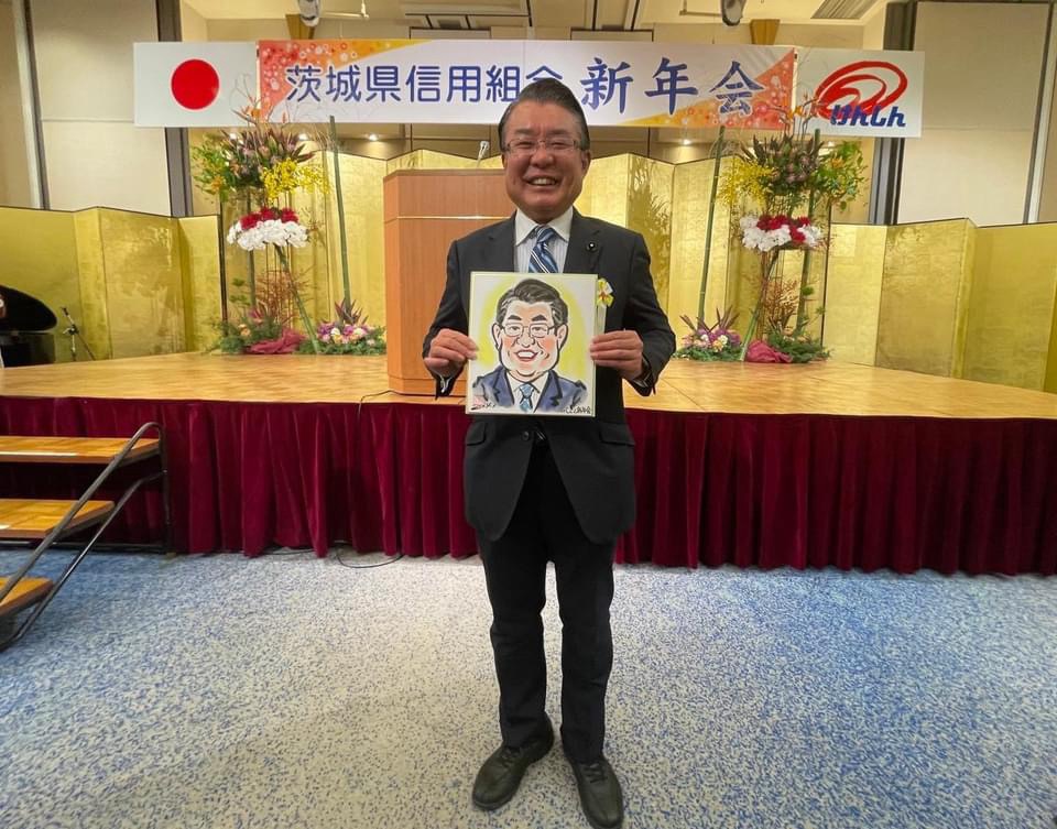 茨城県信用組合の令和6年新年会に出席しました。4年ぶりの開催となり久しぶりに皆様とお会いしました。今年は盛大に開催できて良かったです。本年も引き続き県内経済の発展、中小企業へのご支援をお願い申し上げます。(似顔絵を描いていただきました。)