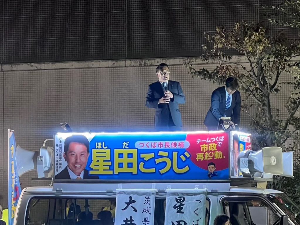 つくば市長選挙・市議会議員選挙が告示になりました。県議会で一緒に仕事をした星田こうじ候補の応援に行きました。大井川茨城県知事も応援に駆けつけてくれました。つくば市は衆議院議員選挙と併せトリプル選挙の状況です。たいへんな選挙戦ですが、ぜひ勝ち上がってほしいと思います。