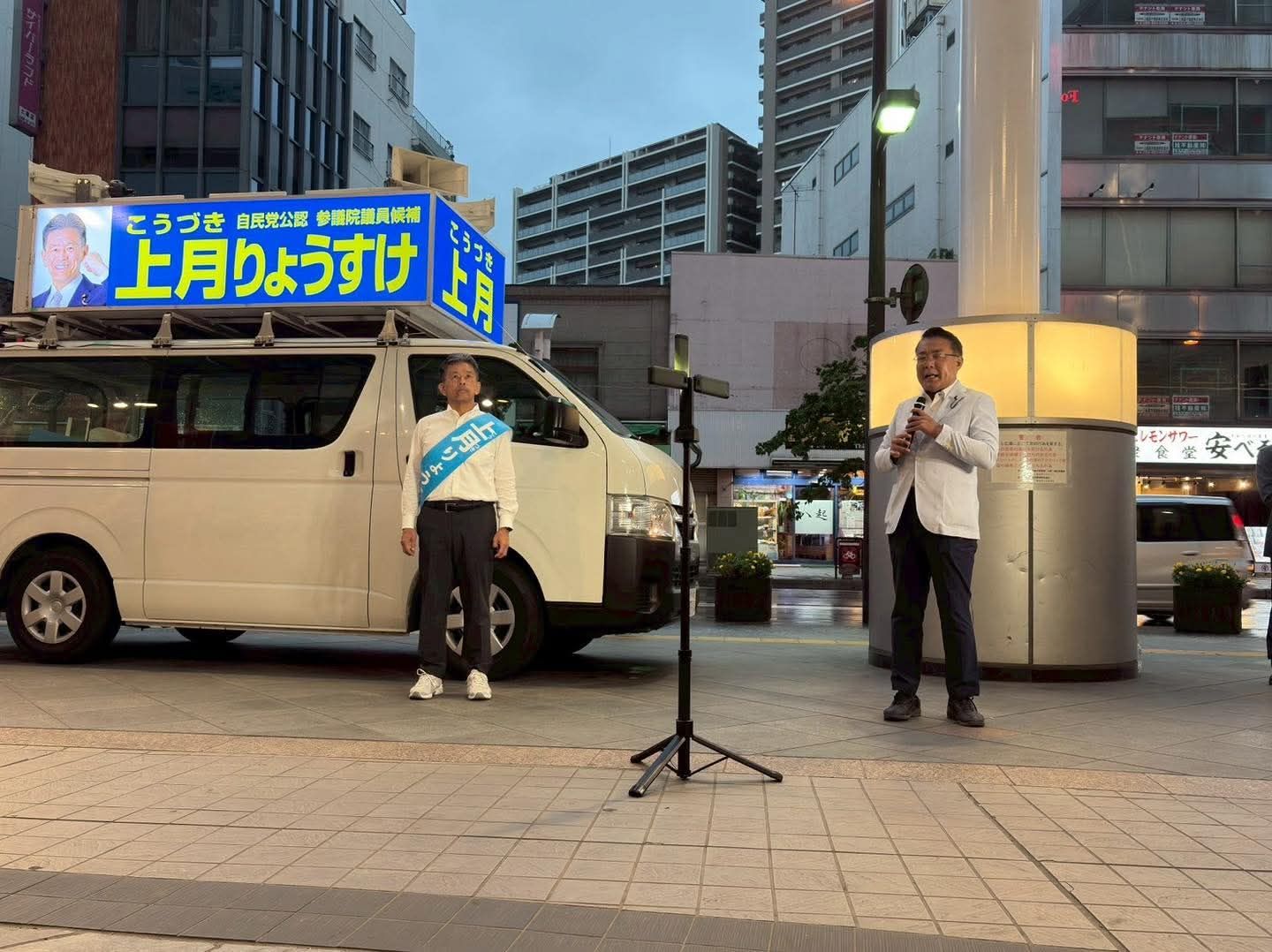 参議院議員茨城県選挙区候補者上月りょうすけ候補の街頭演説会が地元土浦市内でありました。途中から雨に降られましたが多くの方にお集まりいただきました。ありがとうございます。上月候補は茨城県の総務部長や副知事を歴任され私も一緒に仕事をさせていただきましたが、東日本大震災時の対応や県の行財政改革等今の茨城県があるのも上月候補のご尽力の賜物と言っても過言ではありません。厳しい選挙戦ですが上月候補の必勝を心から願います。